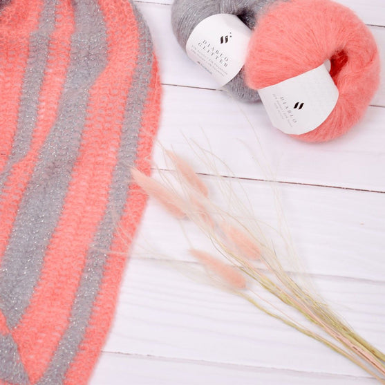It is crocheted in Diablo and Diablo Glitter, both of which are lovely mohair blends, resulting in a lush and fluffy shawl that is also feather light.