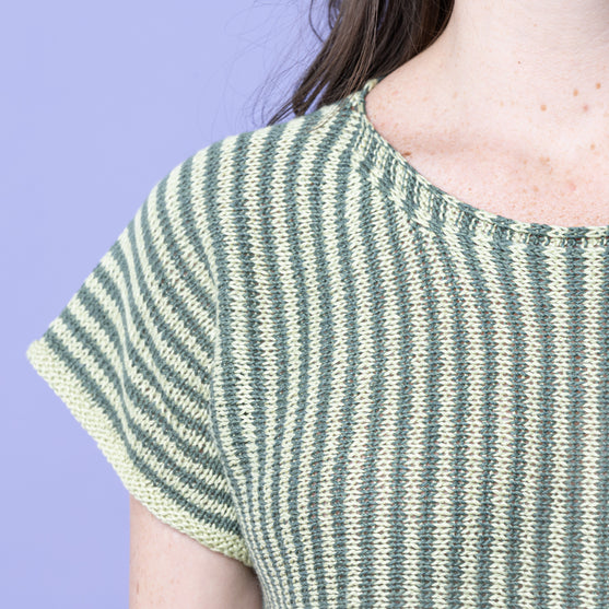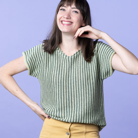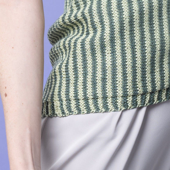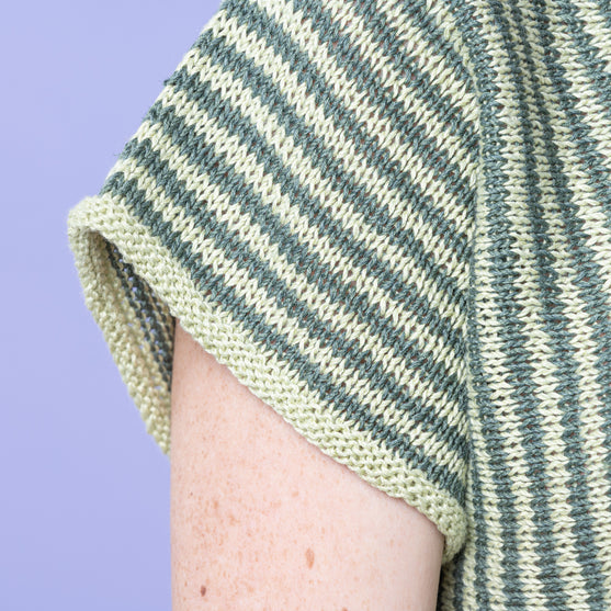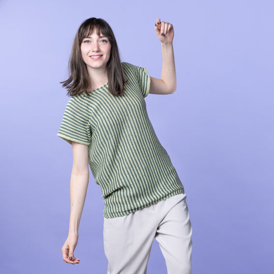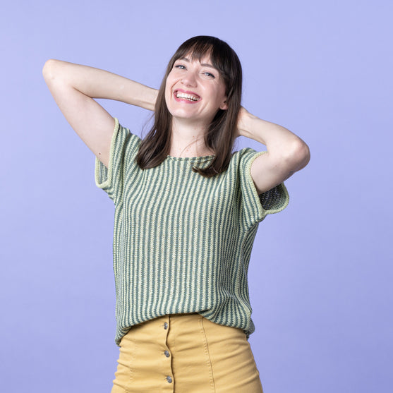 The Lynn t-shirt with the beautiful, thin stripes is knit in the most exquisite, light yarn in a mixture of bamboo, linen, and cotton, which makes it perfect for the summer.