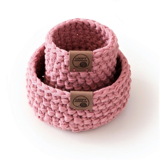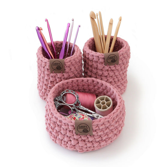 This crocheted basket set makes a unique storage solution for your home or office. It’s perfect for organizing small items and makes a great last minute gift too as it works up quickly.