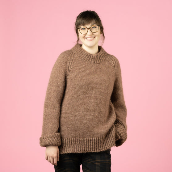 The sweater is knitted top down with raglan increases. First of all, you knit back and forth in rows to form the round neck. After closing the sweater to the round, you work in the raglan increases and the decorative raglan stitches in twisted rib pattern. After separating the sleeves, the body is finished in one piece – the decorative twisted ribbing is growing from round to round and flows into the ribbed hem. Afterwards, the sleeves are separated with the same growing twisted rib pattern, which slows into the ribbed cuffs too.