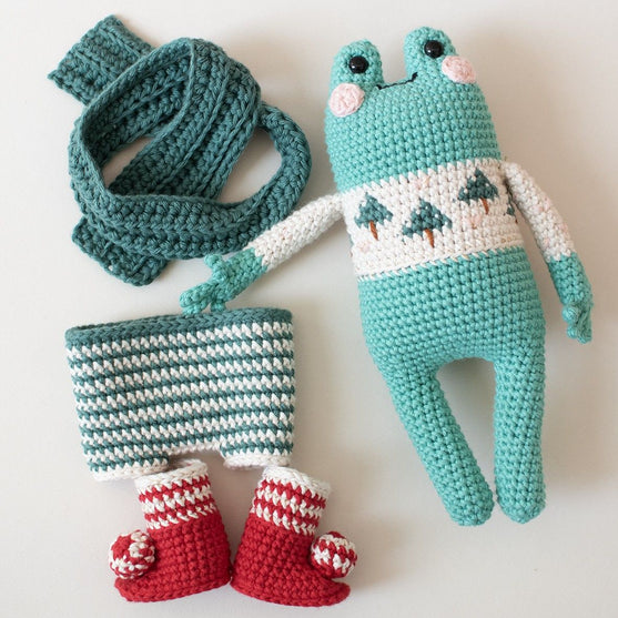 The head, body and legs are worked in a single piece. Oliver Frog also has 3 accessories: a pair of shorts, a scarf and a pair of boots.