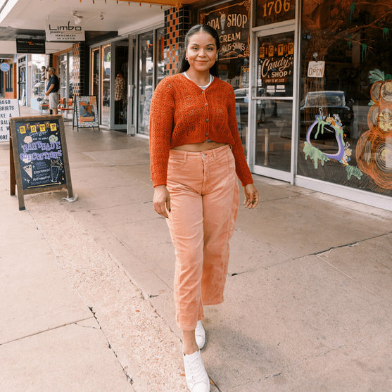 The cardigan is started at the back neck and then increased to the full width of the back. After, those stitches are picked up along the sloped shoulders for the fronts. The pieces are joined at the underarm and the body is knitted in one piece. The sleeve stitches are then picked up from the body and worked in the round. The buttonband is worked with an i-cord bind-off.