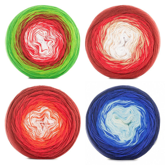 Sultan Christmas is spun from 100% pure, soft cotton and consists of 4 untwisted strands that give the yarn a light and airy drape. The colors change gradually, one strand at a time, creating beautiful, vibrant transitions. Where the colors change, you will find a small knot in one of the strands. This is a natural part of the yarn’s construction, which most crafters just work right over, but if you want an extra elegant finish, you can weave it in instead.