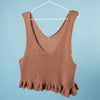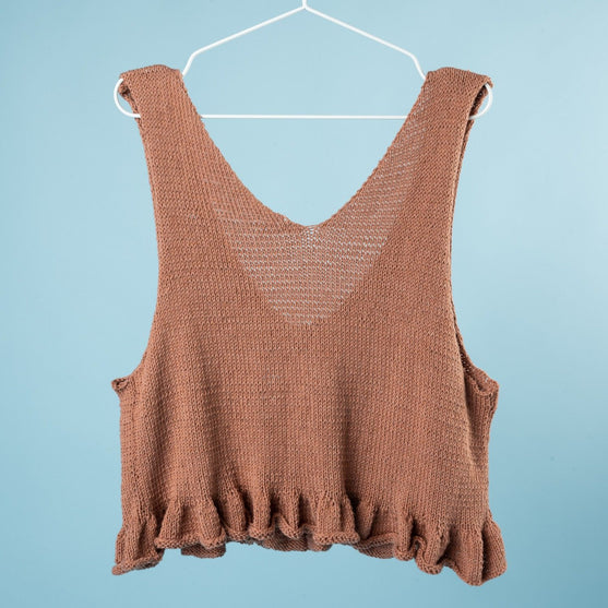 En lättgjord topp med volang i nederkant och djup urringning i ryggen. Stickad i en mjuk bomullsmix, perfekt för sommaren!