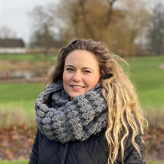 Den är virkad i ett läckert mönster som ger djupa vågor och har en riktigt snygg 3D-effekt som gör tubhalsduken extra tjock och gosig.
