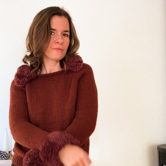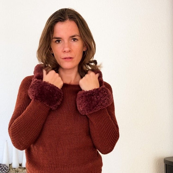 Furry Friend Tröja är en cool tröja med pälskrage och päls i ärmkanten. Tröjan är stickad i ren ull och på tjocka stickor så det är ett snabbt projekt om man vill satsa på pälsmodet.