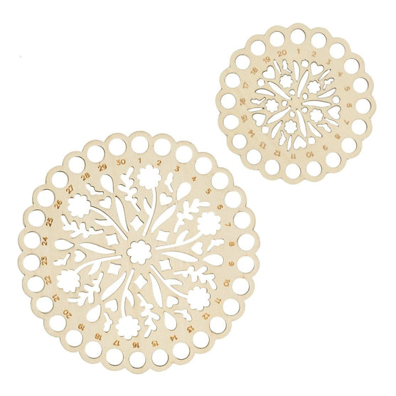 Båda trådhållarna har vackra sniderier med motiv som blommor, blad och hjärtan, och träet har en vacker, naturlig yta. På skivans ena sida finns siffror laserprintade bredvid varje hål.