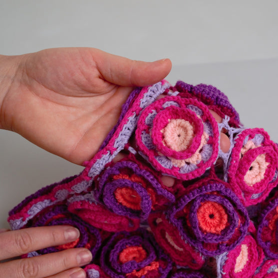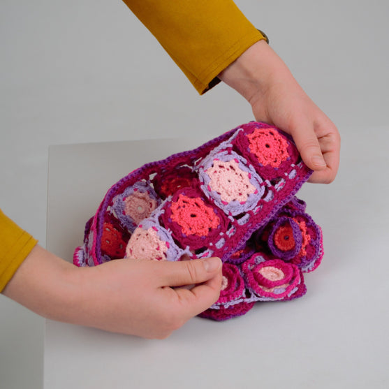 Denna blommiga basker är ett bra projekt för dem som uppskattar färgterapi. Men vill du hellre göra denna basker i enfärgat garn så behöver du bara 4 nystan istället för 6. Den blommiga delen av baskern är densamma för båda storlekarna. Storleken är justerbar tack vare kanten: du kan välja det alternativ som passar dig bäst.