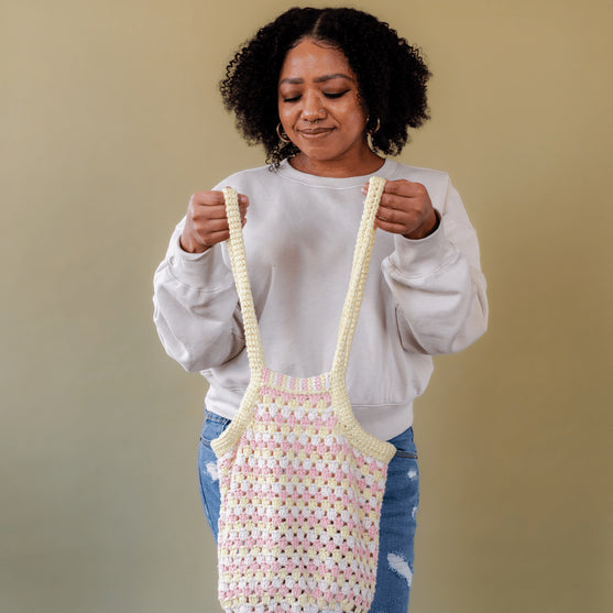 Why buy a project bag when you can make the perfect one?! The Camellia Bag is a granny bucket bag made with three alternating colors of luxuriously soft Cotton Silk yarn. The sturdy handle is made with simple Tunisian crochet techniques. Thoughtful assembly and finishing steps add a necessary polish to elevate this handmade bag into something truly special.