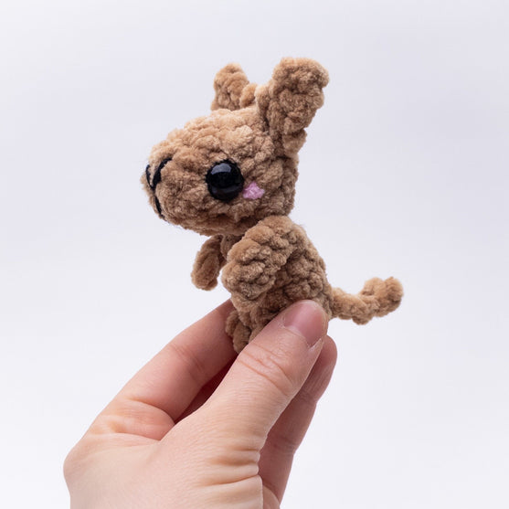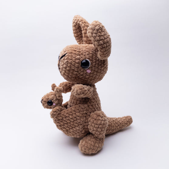 En känguru med sin bebis bara för dig! Och du behöver bara några timmar för att göra den med detta enkla virkmönster! Mönstret innehåller massor av bilder på de olika stegen samt detaljerade instruktioner och videor om hur du monterar ihop dina nya vänner.